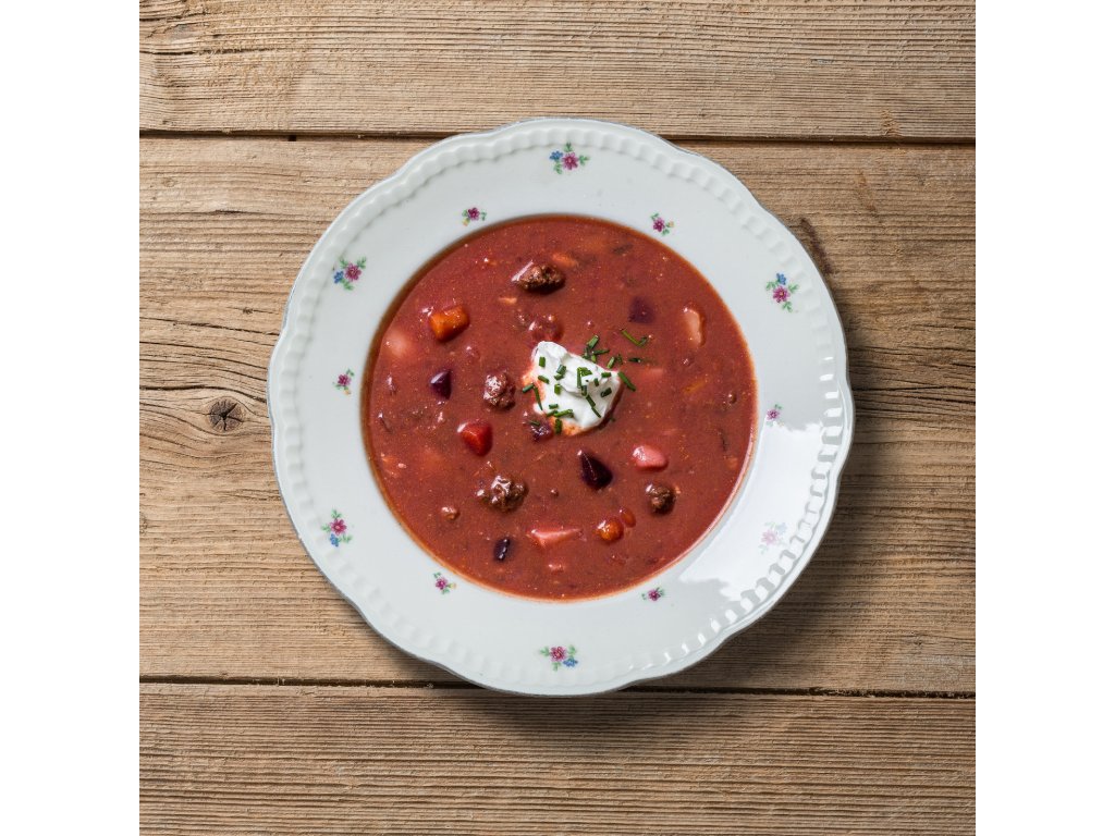 Hutná svačinová polévka z červené řepy s kousky hovězího a vepřového masa dušeného na kořenové zelenině s bramborem a hlávkovým zelím, zjemněná smetanou.