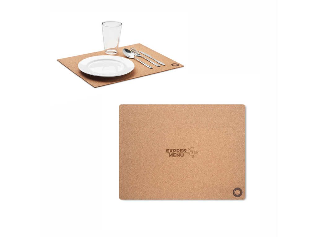 Prostírání z korku. Tloušťka 3 mm. Velikost: 40×30 cm. Korek je přírodní materiál, vzhledem ke své struktuře a povrchové pórovitosti může být výsledek tisku na stejných předmětech rozdílný.