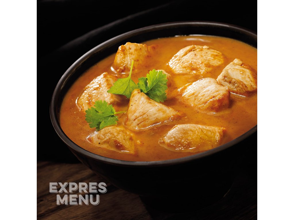 kuřecí prsa (33 %), rajčata krájená [rajčata (60 %), rajčatová šťáva, jedlá sůl, regulátor kyselosti: kyselina citronová], smetana, máslo (7,2 %), cibule, koření garam masala, limetková šťáva, česnek, sůl kamenná, koriandr, zázvor mletý, kurkuma, skořice mletá, římský kmín.