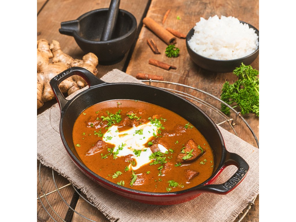 Jemná smetanová indická omáčka s kousky pečených kuřecích prsou, ochucená originálním kořením garam masala, zázvorem, kurkumou a koriandrem. Náš tip: skvěle chutná s basmati rýží