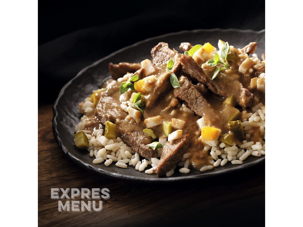 Křehké nudličky hovězího masa s okurkou, vajíčkem a uzeným špekem, s jemnou omáčkou z taženého vývaru, cibule a pepře. Přílohou je rýže parboiled.