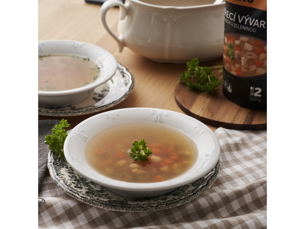 Základem polévky je pomalu tažený vývar s kvalitní kořenovou zeleninou a kousky libového kuřecího masa.