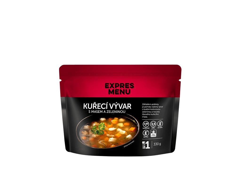 kuřecí vývar (voda, kuřecí maso a kosti, cibule, česnek, bobkový list, nové koření, pepř, sůl), směs zeleniny (mrkev, celer, petržel) (23 %), kuřecí maso (5 %), sůl kamenná, pepř.