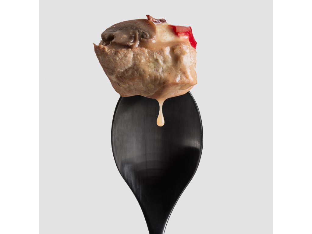 Vepřová kýta a krůtí maso s omáčkou na uzeném špeku, s restovanou cibulkou, žampiony a česnekem. Pikantnost pokrmu dodávají feferonky a chilli.