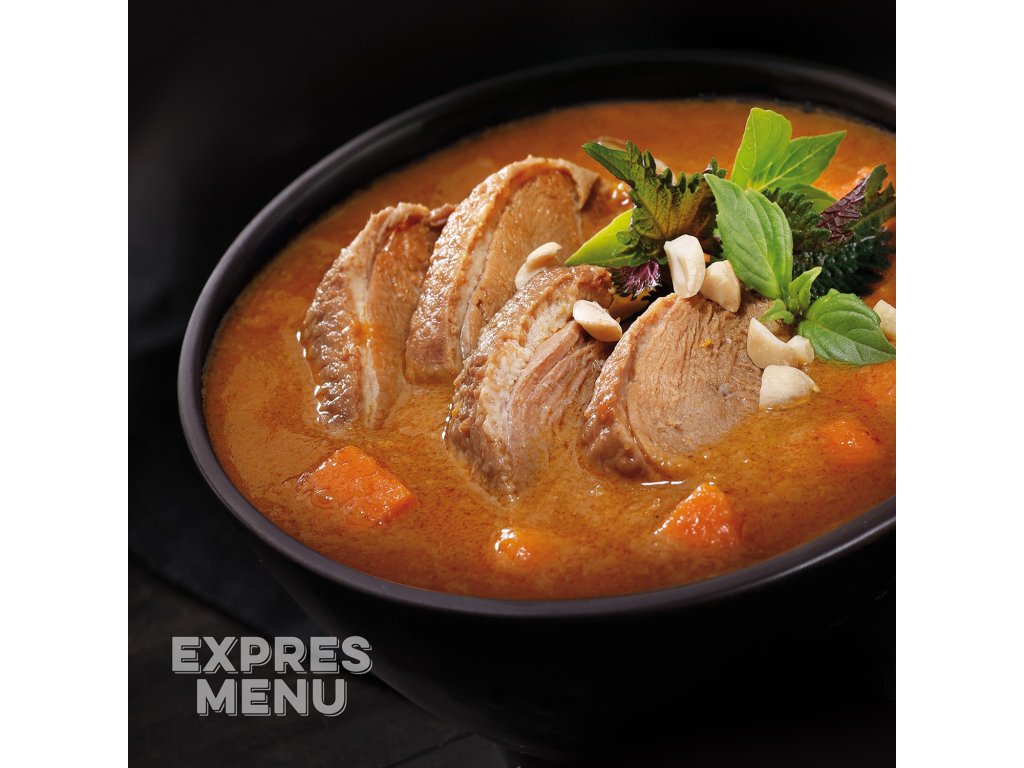 Křehká kachní prsa v jemně pálivém thajském kari s batáty, mrkví a kokosovým mlékem, dochucená tamarindovou a massaman pastou s vybranou směsí exotického koření.