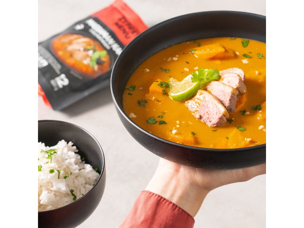 kachní prasa (33%), kokosové mléko(16%) (kokos, pitná voda), batáty(10,7%), mrkev(5,9%), červená cibule, arašídy, massaman kari pasta(2%)(chilli 20%, česnek, šalotka, jedlá sůl, citrónová tráva, kmín, koriandrová semena, galgán), kuřecí vývar(kuřecí kosti, pitná voda), rýžová mouka, kukuřičná mouka, rybí omáčka(1,5%)(extrakt ze sardele obecné (63 %), pitná voda, jedlá sůl, cukr), cukr třtinový, limetková šťáva, tamarind pasta(1%)(tamarind 96%, pitná voda, jedlá sůl), římský kmín, koriandr mletý, bobkový list, kardamon.