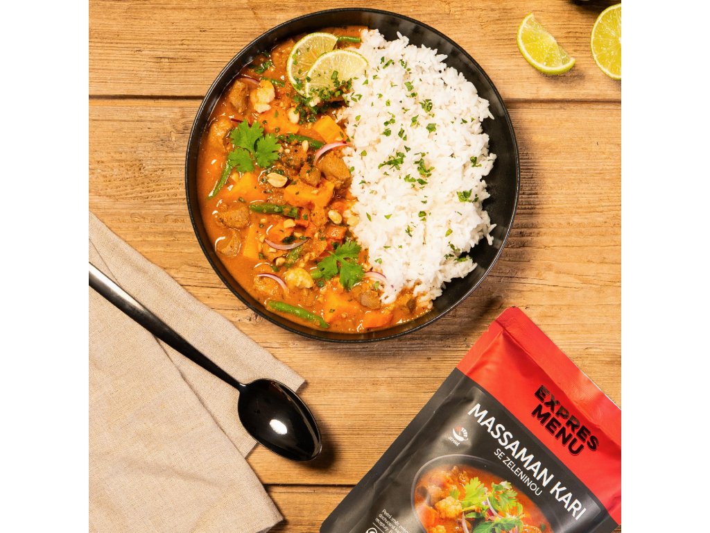 Pestrá směs zeleniny v krémové omáčce z kokosového mléka, dochucená massaman kari pastou a tamarindem. Bezmasá pochoutka, která si skvěle rozumí s rýží či nudlemi.