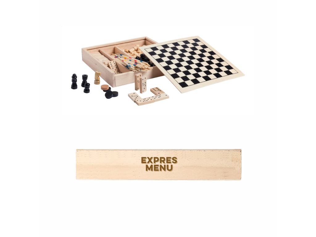 Dřevěná sada her – šachy, domino, mikádo a dáma.