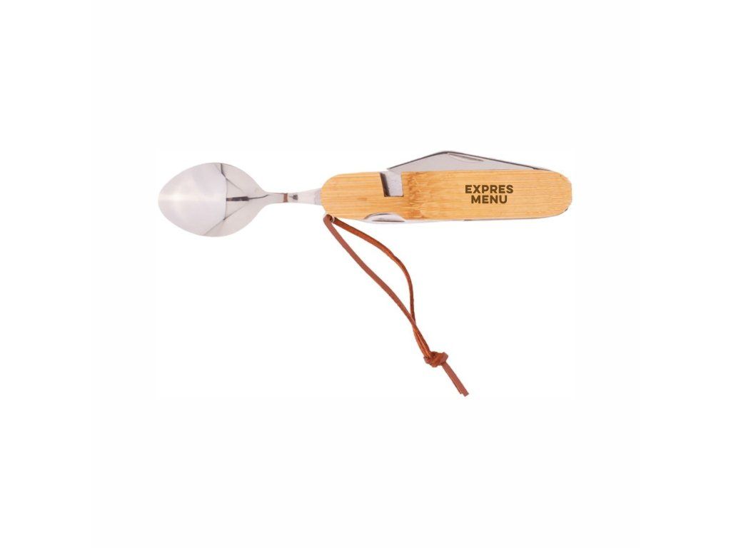 Nerezový multifunkční kapesní nůž a skládací příbory s bambusovou rukojetí a šňůrkou z PU kůže. Se 7 funkcemi: nůž, vidlička, lžíce, otvírák na láhve a konzervy, vývrtka a děrovač kůže. Při použití jako příbor se rozděluje na 2 části.